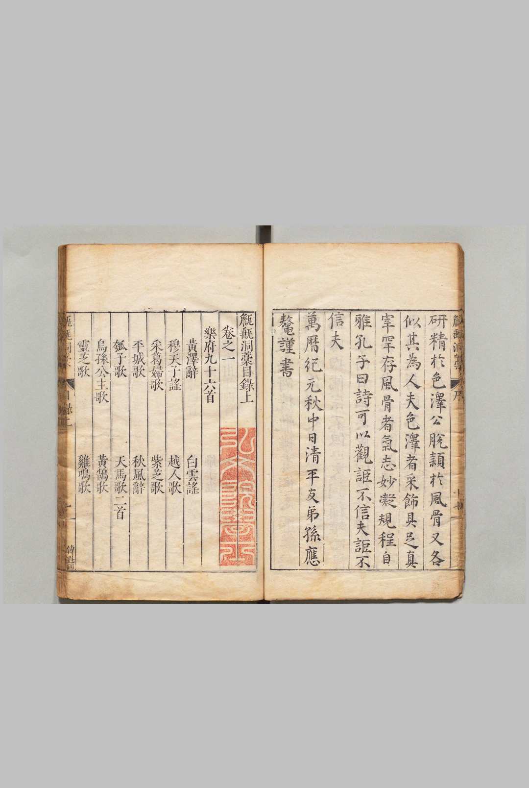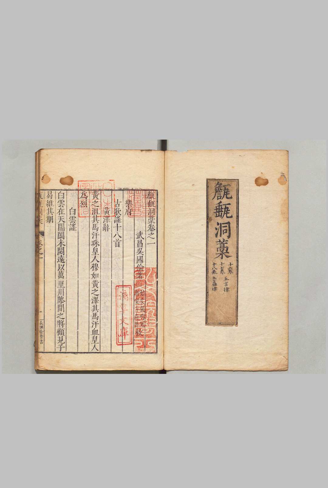 《甔甀洞稿》为明代文学家吴国伦所著诗文集,属“后七子”派重要文献。全书共54卷,目录2卷,收录乐府、古诗、律诗、碑铭、序跋等诗文两千余篇,涵盖四言至七言各体。现存代表性版本为清道光十年(1830年)桂芬斋木活字印本,版式规整,四周双边,单黑鱼尾,分四函装订。